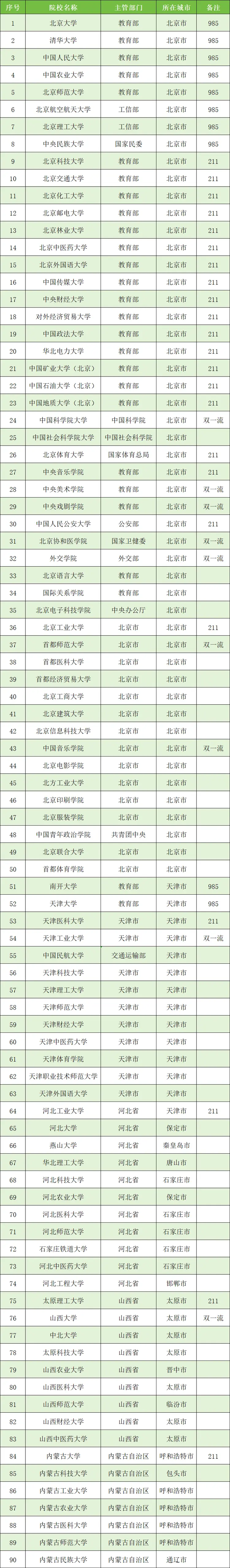 其中,北京50所,天津13所,河北11所,山西9所,内蒙古7所;