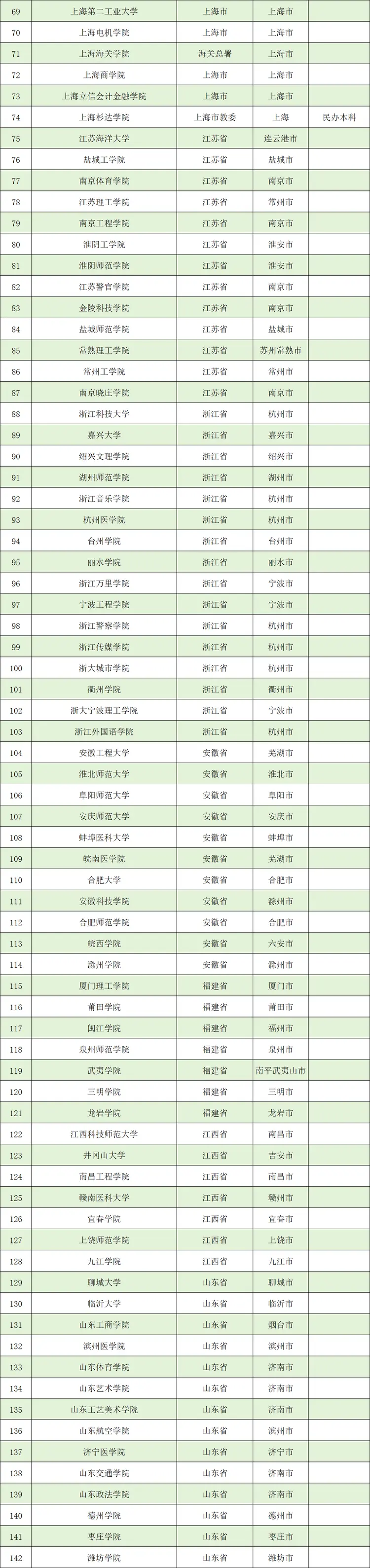 其中,上海24所,江苏28所,浙江17所,安徽11所,福建10所,江西11所,山东21所;
