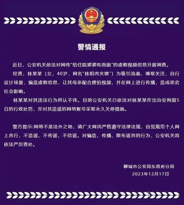 山东省聊城市公安局东昌府分局星期天(12月17日)发布警情通报,公安机关近日依法对网传“给住院婆婆吃泡面”的虚假视频信息开展调查。