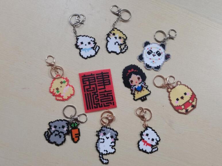 在蒋梦轩的指导下,同学们小心翼翼的熨烫着自己的“小猫”“小熊”“冰墩墩”……不断注意豆豆的融化粘连情况,最后打孔挂上钥匙链,获得专属自己的“像素风”小挂件。