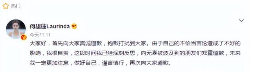 眼见事态闹大,何超莲今天发文道歉:“由于自己的不恰当言论造成了不好的影响,我很自责,这段时间我已经深刻反思,向无辜被波及到的朋友们郑重道歉,未来我一定更加注意,做好自己,谨言慎行,再次向大家道歉。”