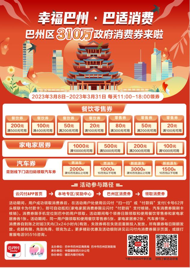家电家居消费券:用户领券后,可在活动商户处使用云闪付APP出示“付款码”完成支付即可自动抵扣(手机GPS同步定位巴中市)。