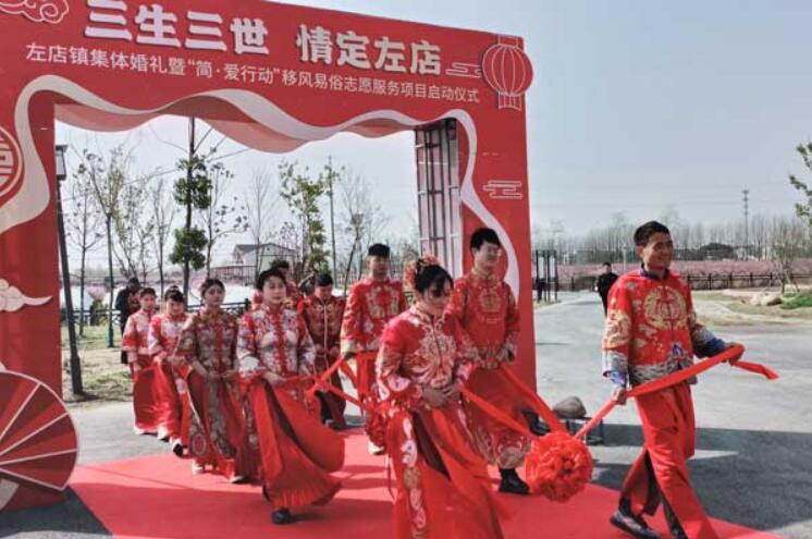 长丰左店乡村振兴示范园里,五百亩桃花盛开,点缀出盈盈乡村春日景。“今日幸为秦晋会,早教鸾凤下妆楼。”3月16日,身着秀禾婚服的五对新人遵循古朴中式习俗,完成三拜礼、结发礼、合卺礼等,在众亲朋见证下正式结为夫妻。