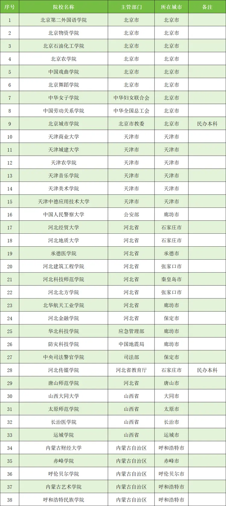 其中,北京9所,天津6所,河北14所,山西4所,内蒙古5所;