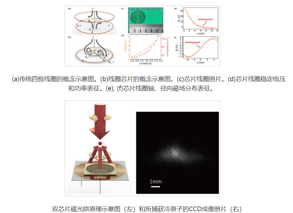 然而对于磁光阱的另一重要组成部分——磁场线圈,大家仍然只能采用三维的线圈对来实现。如果磁场线圈的尺寸较大,则需要更粗的导线和更强的电流来实现所学的磁场梯度,功耗大,发热严重。如果将线圈的尺寸减小,则线圈可能会严重阻碍光路,减小可供使用光学窗口大小。为解决这一问题,邹长铃课题组与卢征天教授合作,提出了一种全新的平面化磁场线圈构型,仅需一块3cm×3cm的芯片即可产生磁光阱所需的四极磁场。基于中国科学技术大学的微纳加工中心,他们自主设计和加工了相互匹配的磁场芯片与光栅芯片,并基于此成功地俘获了超过106个低温87Rb原子,证明了这个新颖构型的实用性。