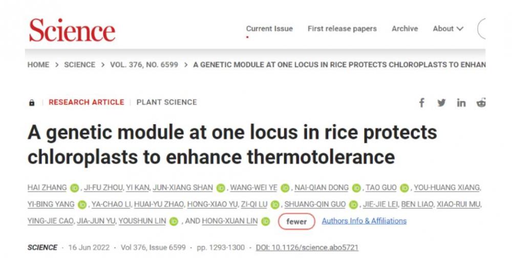 2022年6月16日,中国科学院分子植物科学卓越创新中心林鸿宣研究团队与上海交通大学农业与生物学院林尤舜研究团队合作共同通讯在Science 在线发表题为“A genetic module at one locus in rice protects chloroplasts to enhance thermotolerance”的研究论文。经过近10年的努力,研究团队成功分离克隆了水稻高温抗性新基因位点TT3,并且阐明了其调控高温抗性的新机制。该成果不仅首次揭示了在一个控制水稻抗热复杂数量性状的基因位点(TT3)中存在由两个拮抗的基因(TT3.1和TT3.2)组成的遗传模块调控水稻高温抗性的新机制和叶绿体蛋白降解新机制;同时发现了第一个潜在的作物高温感受器。